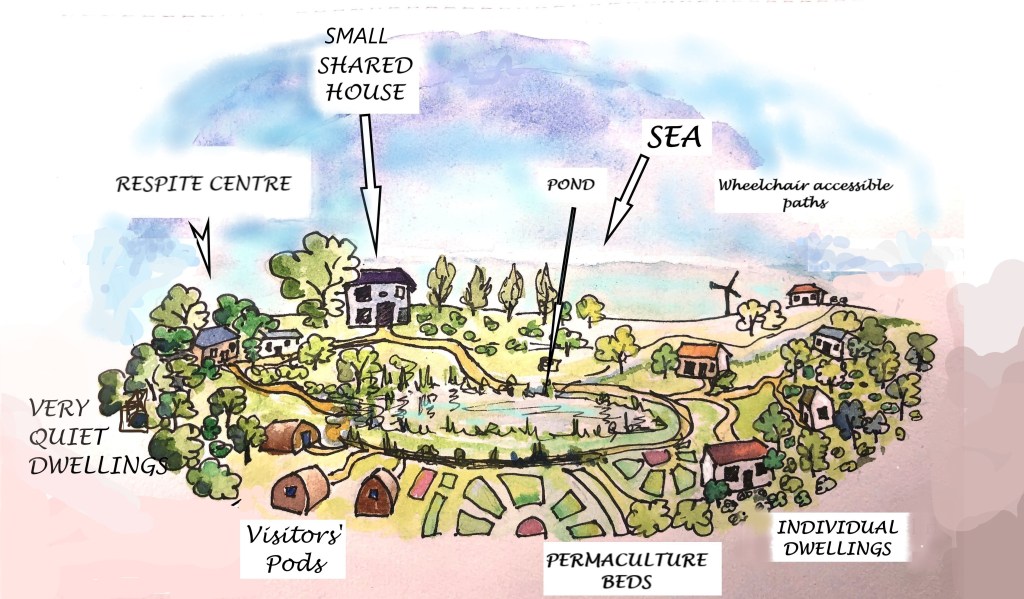 This website explains how we see a community open to anyone interested in managing energy and sensitivities, whatever their health status. We think it needs to be cooperative, rural, with fully accessible individual dwellings as well as a shared house … and, at its heart, a retreat for people with severe energy issues…
